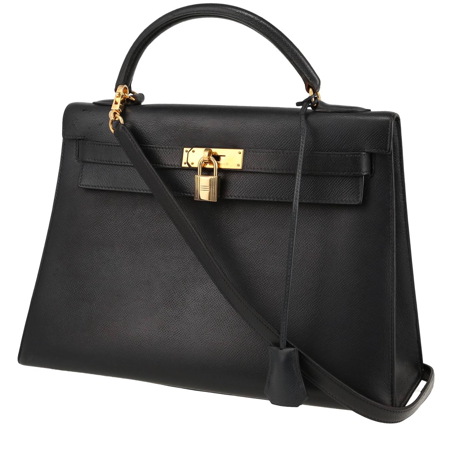 Magnífico bolso de mano Hermès Kelly 32 cm de cuero Courchevel azul marino, adorno en metal dorado, asa sencilla de cuero azul marino, bandolera extraíble de cuero azul marino para llevar en la mano o al hombro.