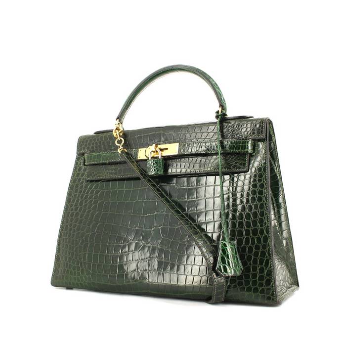 Espléndido bolso de mano "Kelly 35 cm" de cocodrilo, adorno en metal dorado, asa de cocodrilo verde, bandolera de cocodrilo verde para llevar en la mano o al hombro.