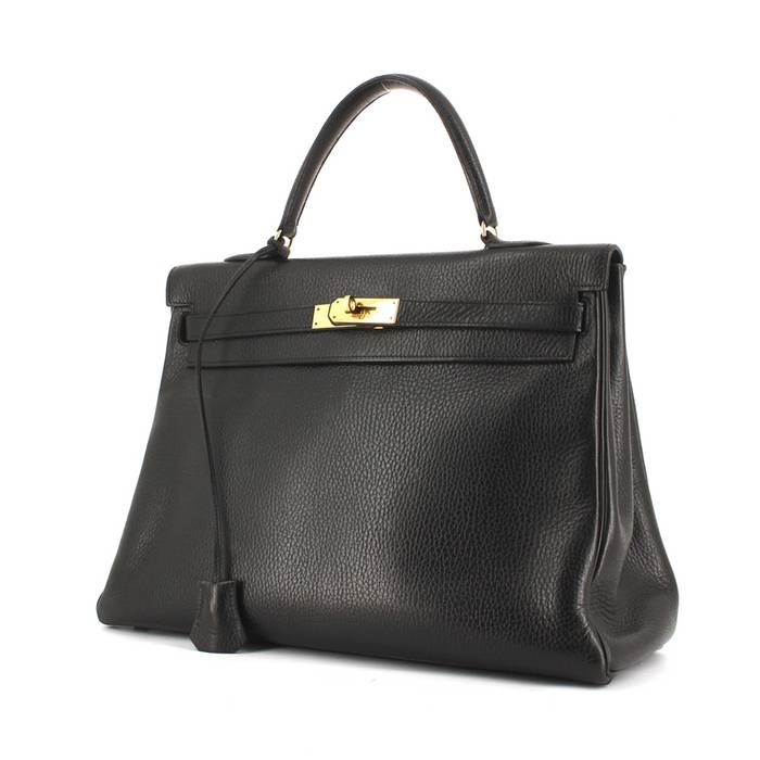 Bonito bolso de mano "Kelly 35 cm" de cuero Ardenne negro, adorno en metal dorado, asa sencilla de cuero negro para llevar en la mano.