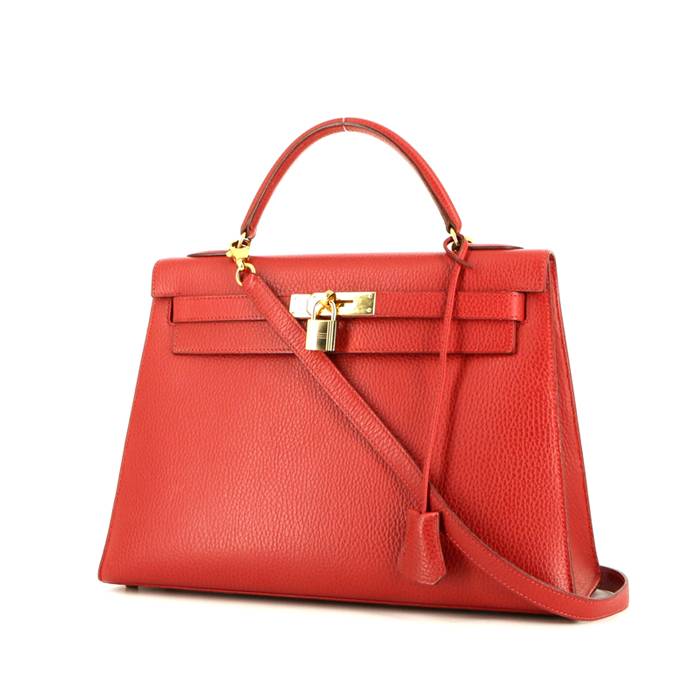 Clásico bolso de mano Hermes Kelly 35 cm de cuero Ardenne rojo, adorno en metal dorado, pespunte guarnicionero, asa de cuero rojo, bandolera extraíble de cuero rojo para llevar en la mano o al hombro.
