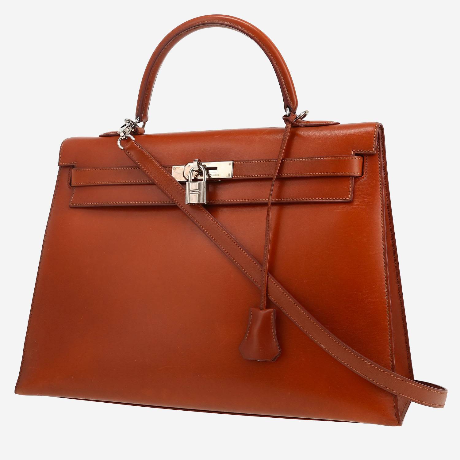 Elegante bolso de mano Hermès Kelly 35 cm de cuero box marrón, adorno en metal plateado paladio, asa sencilla de cuero marrón, bandolera extraíble de cuero marrón para llevar en la mano o al hombro.