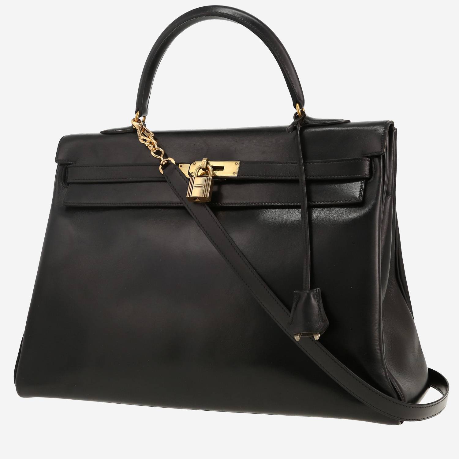 Inconfundible bolso de mano Hermès Kelly 35 cm de cuero box negro, adorno en metal dorado, asa sencilla de cuero negro, mango sin signo extraíble de cuero negro para llevar en la mano o al hombro.