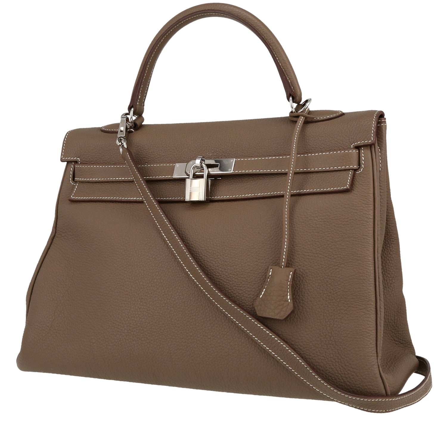 Precioso bolso de mano Hermès Kelly 35 cm de cuero togo etoupe, adorno en metal plateado paladio, sobrecosturas blancas, asa sencilla de cuero marrón etoupe, bandolera extraíble de cuero marrón etoupe para llevar en la mano o colgado al hombro o cruzado.