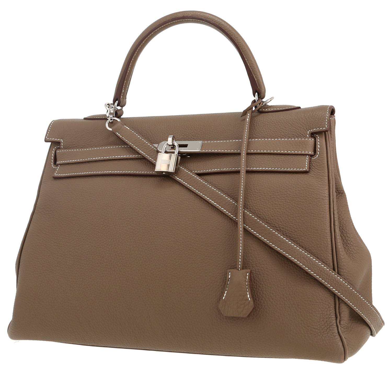 Famoso bolso de mano Hermès Kelly 35 cm de cuero togo etoupe, adorno en metal plateado paladio, asa sencilla de cuero marrón etoupe, bandolera extraíble de cuero marrón etoupe para llevar en la mano o al hombro.