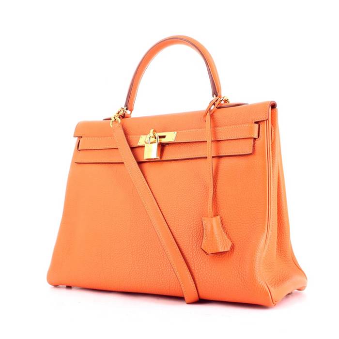 Encantador bolso de mano "Kelly 35 cm" de cuero togo naranja, adorno en metal dorado, asa de cuero naranja, bandolera de cuero naranja para llevar en la mano o al hombro.