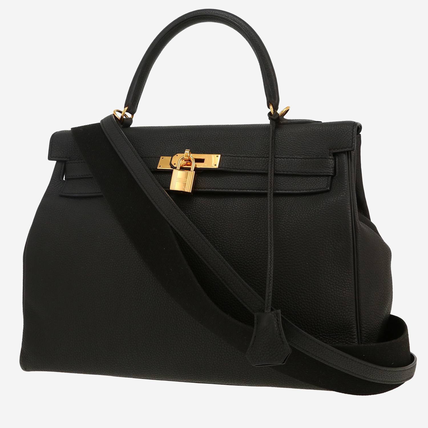 Inconfundible bolso de mano Hermès Kelly 35 cm de cuero togo negro, adorno en metal dorado, asa sencilla de cuero negro, una asa extraíble de lona negra, bandolera extraíble de cuero negro para llevar en la mano o colgado al hombro o cruzado.
