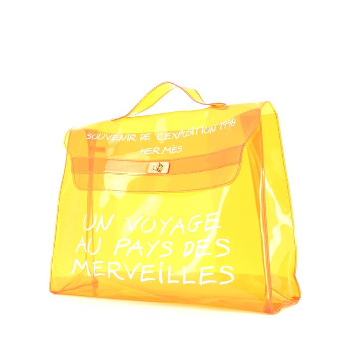 Original bolso de mano "Kelly 40 cm" de vinilo naranja, asa sencilla para llevar en la mano.