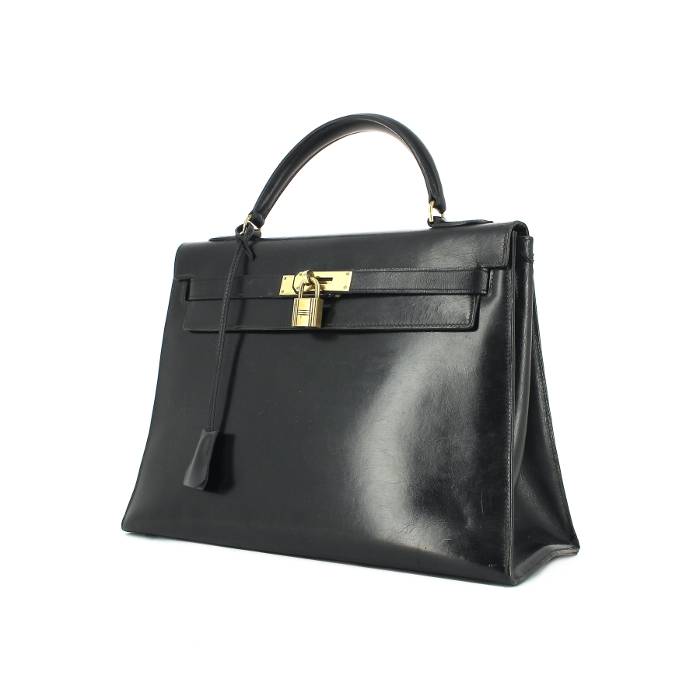 Encantador bolso de mano "Kelly 32 cm" de cuero box negro, adorno de metal dorado, asa sencilla de cuero negro para llevar en la mano.