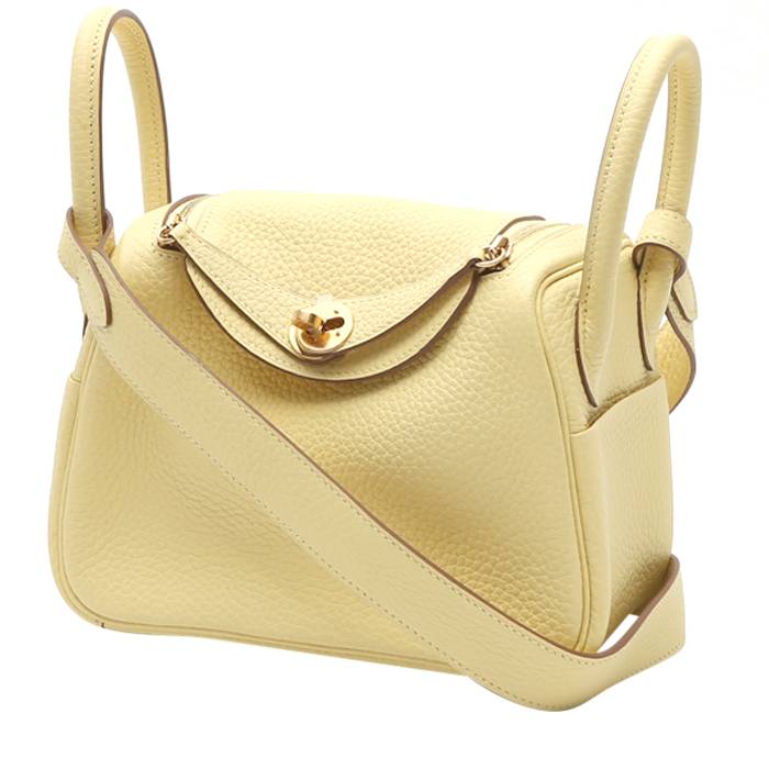 Encantador bolso bandolera Hermès Lindy mini de cuero togo Jaune Poussin, adorno en metal dorado, doble asa de cuero Jaune Poussin, una asa sencilla de cuero Jaune Poussin para llevar en la mano o colgado al hombro o cruzado.