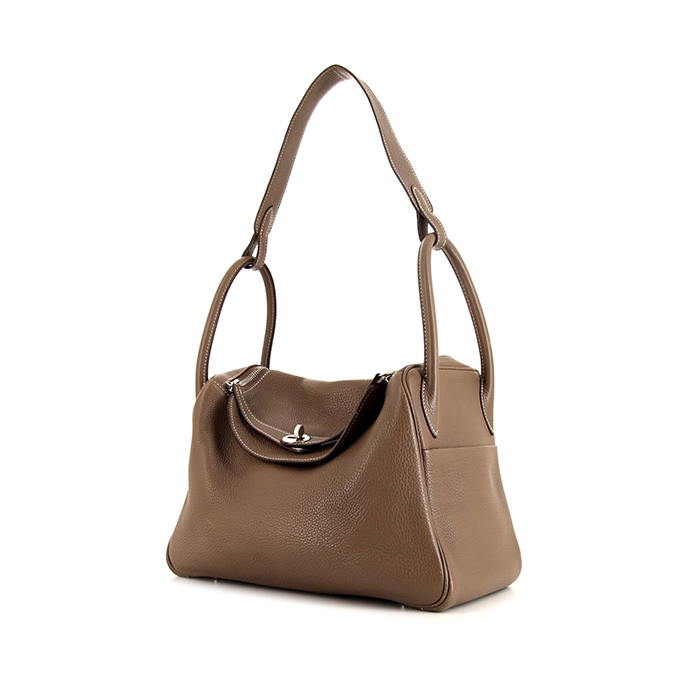 Elegante bolso de mano Hermes Lindy de cuero togo marrón etoupe, adorno en metal plateado paladio, doble asa de cuero togo marrón etoupe, una asa sencilla de cuero togo marrón etoupe para llevar en la mano o al hombro.