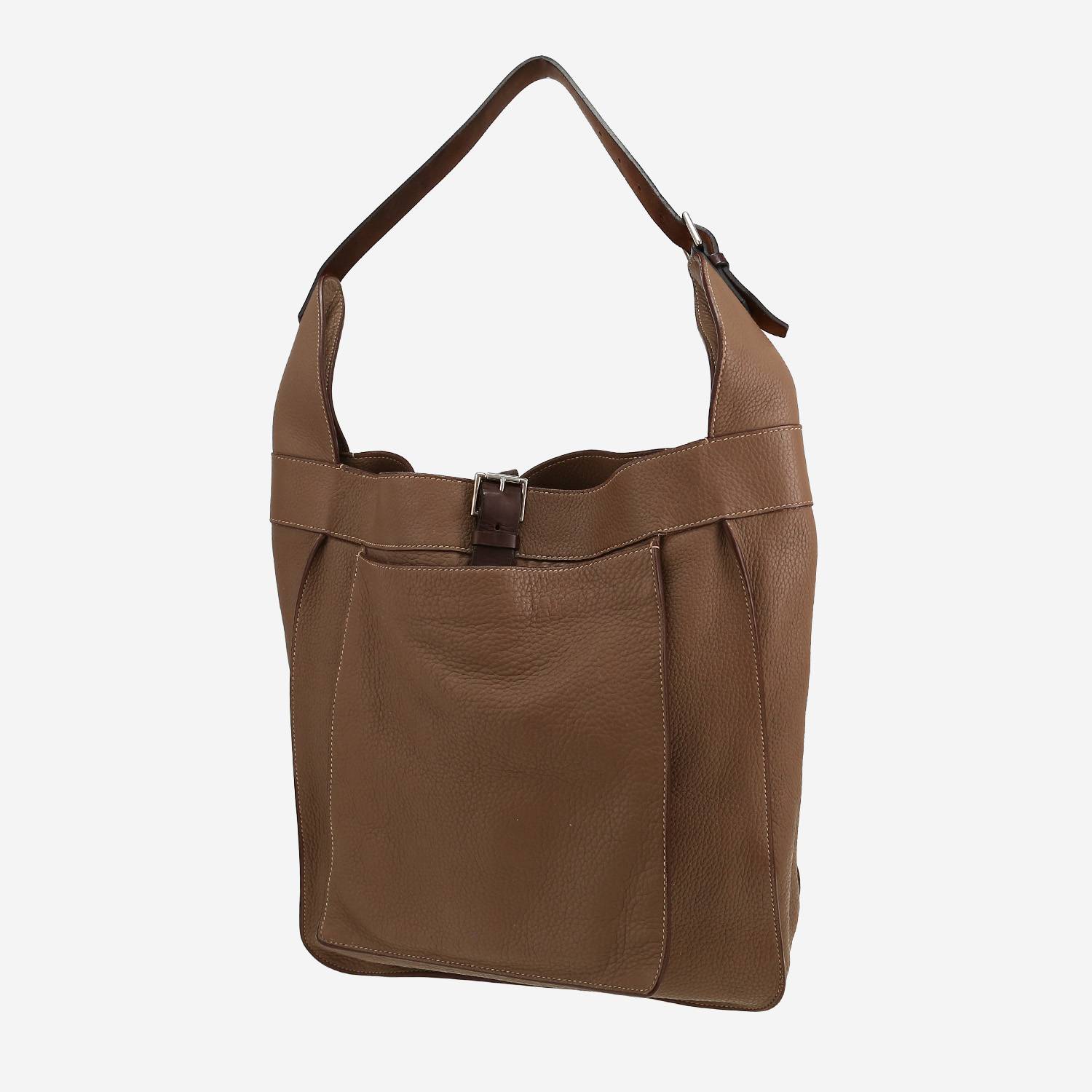 Práctico bolso para llevar al hombro Hermès Marwari de cuero togo etoupe, adorno en metal plateado paladio, una asa ajustable de cuero marrón para llevar en la mano o al hombro.