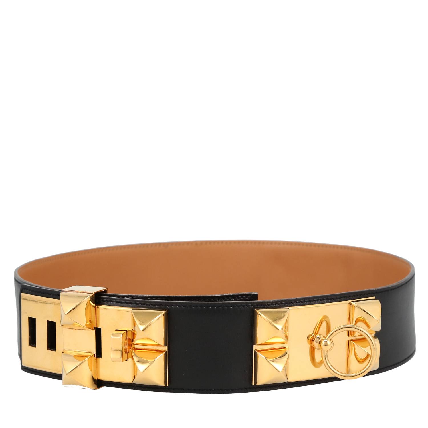 Magnífico cinturón Hermès Médor de cuero box negro, adorno en metal dorado.
