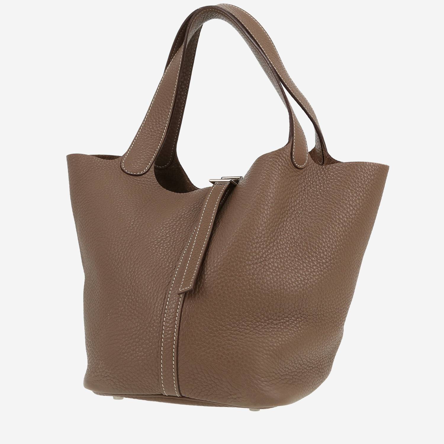 Magnífico bolso de mano Hermès Picotin 22 cm de cuero taurillon clémence etoupe, adorno en metal plateado paladio, doble asa de cuero marrón etoupe para llevar en la mano.