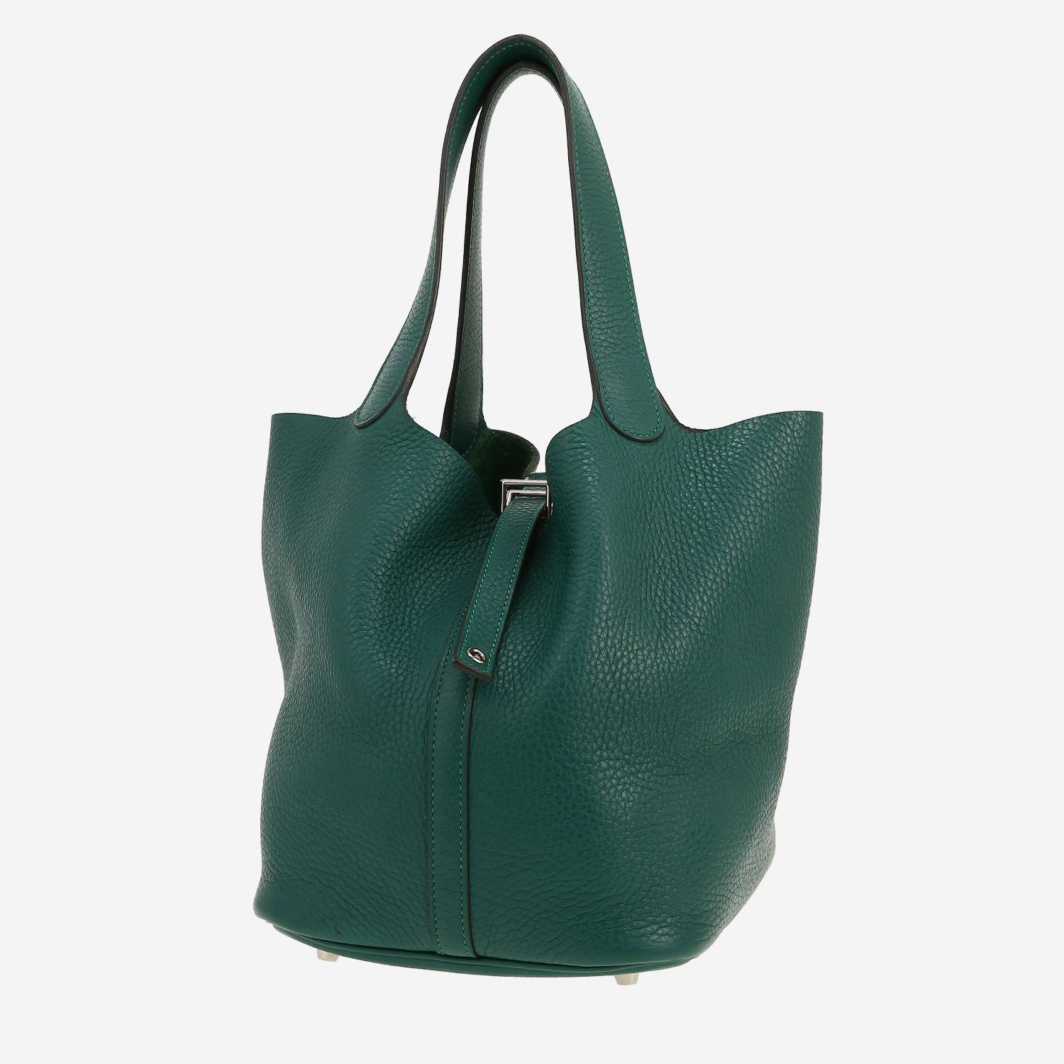 Magnífico bolso de mano Hermès Picotin 22 cm de cuero taurillon clémence verde malaquita, adorno en metal plateado paladio, doble asa de cuero verde malaquita para llevar en la mano.