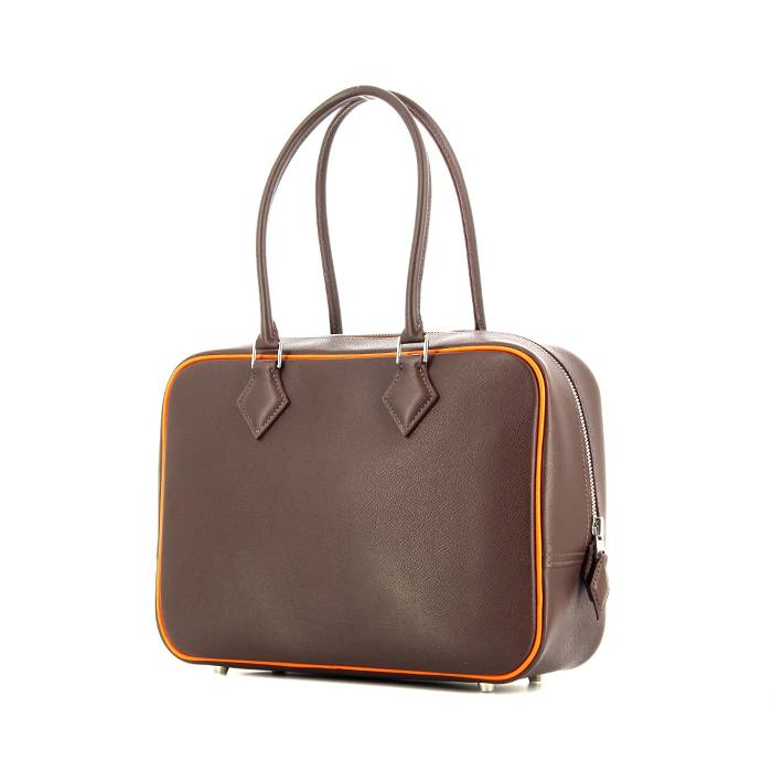 Encantador bolso de mano Hermes Plume modelo mediano de cuero epsom marrón y de junco naranja, adorno en metal plateado, doble asa de cuero marrón para llevar en la mano o al hombro.
