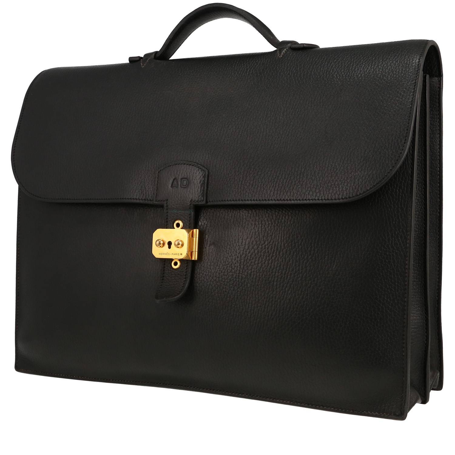 Inconfundible porta-documentos Hermès Sac à dépêches de cuero Ardenne negro, adorno en metal dorado, asa sencilla de cuero negro para llevar en la mano.