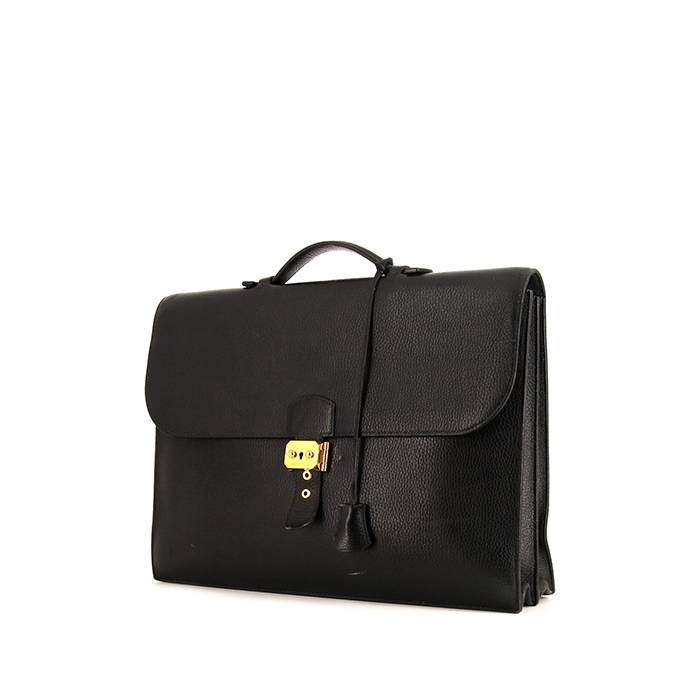 Elegante porta-documentos Hermès Sac à dépêches de cuero Fjord negro, adorno en metal dorado, asa sencilla de cuero negro para llevar en la mano.