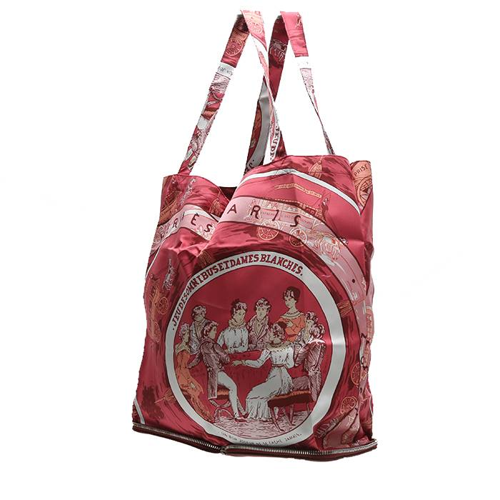 Práctico bolso Cabás Hermès Silky Pop - Shop Bag de lona estampada rojo estampado y cuero togo rojo H, adorno en metal plateado paladio, doble asa de lona roja para llevar en la mano o al hombro.