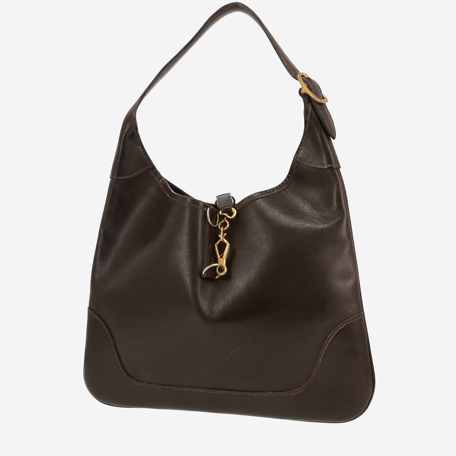 Magnífico bolso para llevar al hombro Hermès Trim de cuero box marrón, adorno en metal dorado, una asa calado de cuero marrón para llevar en la mano o al hombro.
