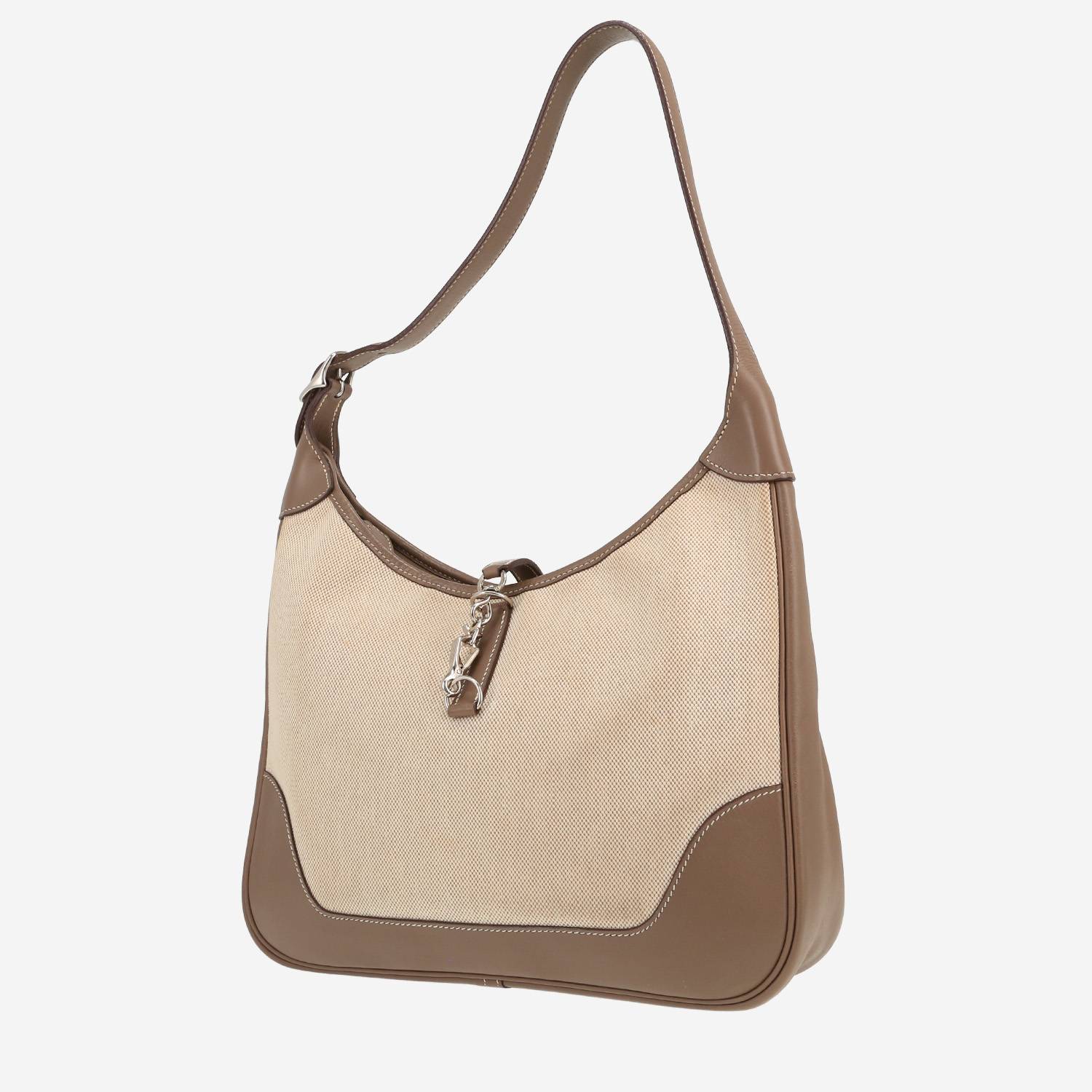 Magnífico bolso para llevar al hombro o en la mano Hermès Trim de lona beige y cuero marrón etoupe, adorno en metal plateado paladio, una asa ajustable de cuero marrón etoupe para llevar en la mano o al hombro.