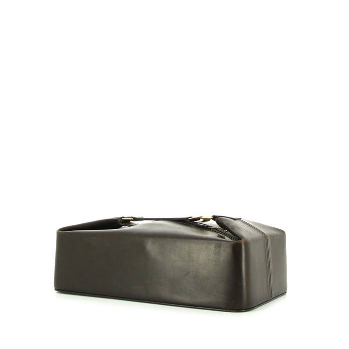 Delicado vanity Hermes de cuero box marrón oscuro, adorno en metal dorado, asa de cuero marrón para llevar en la mano.