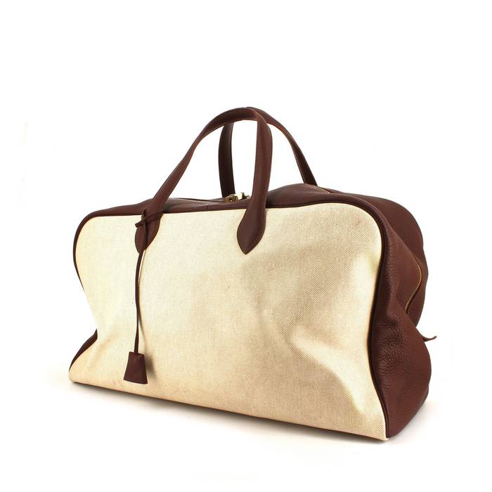 Elegante bolsa de viaje Hermes Victoria de cuero togo marrón y de lona beige, adorno en metal dorado, doble asa de cuero marrón para llevar en la mano.