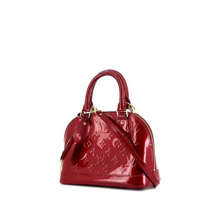 Elegante bolso bandolera Louis Vuitton Alma BB de charol Monogram rojo, adorno en metal dorado, doble asa de charol rojo, bandolera extraíble de charol rojo para llevar en la mano o colgado al hombro o cruzado.