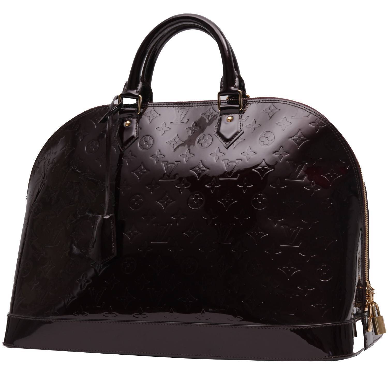 Inconfundible bolso de mano Louis Vuitton Alma modelo grande de charol Monogram color berenjena, adorno en metal dorado, doble asa de charol color berenjena para llevar en la mano.