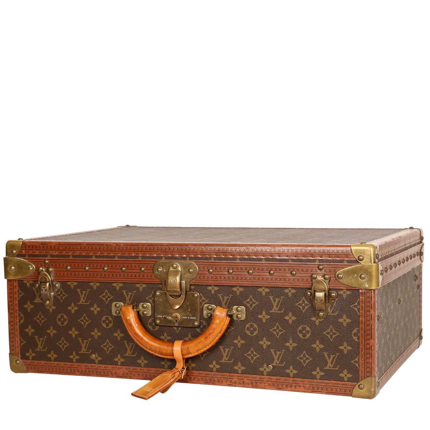 Magnífica maleta Louis Vuitton Alzer 60 de lona Monogram marrón y cuero natural, adorno en metal dorado, asa de cuero natural para llevar en la mano.