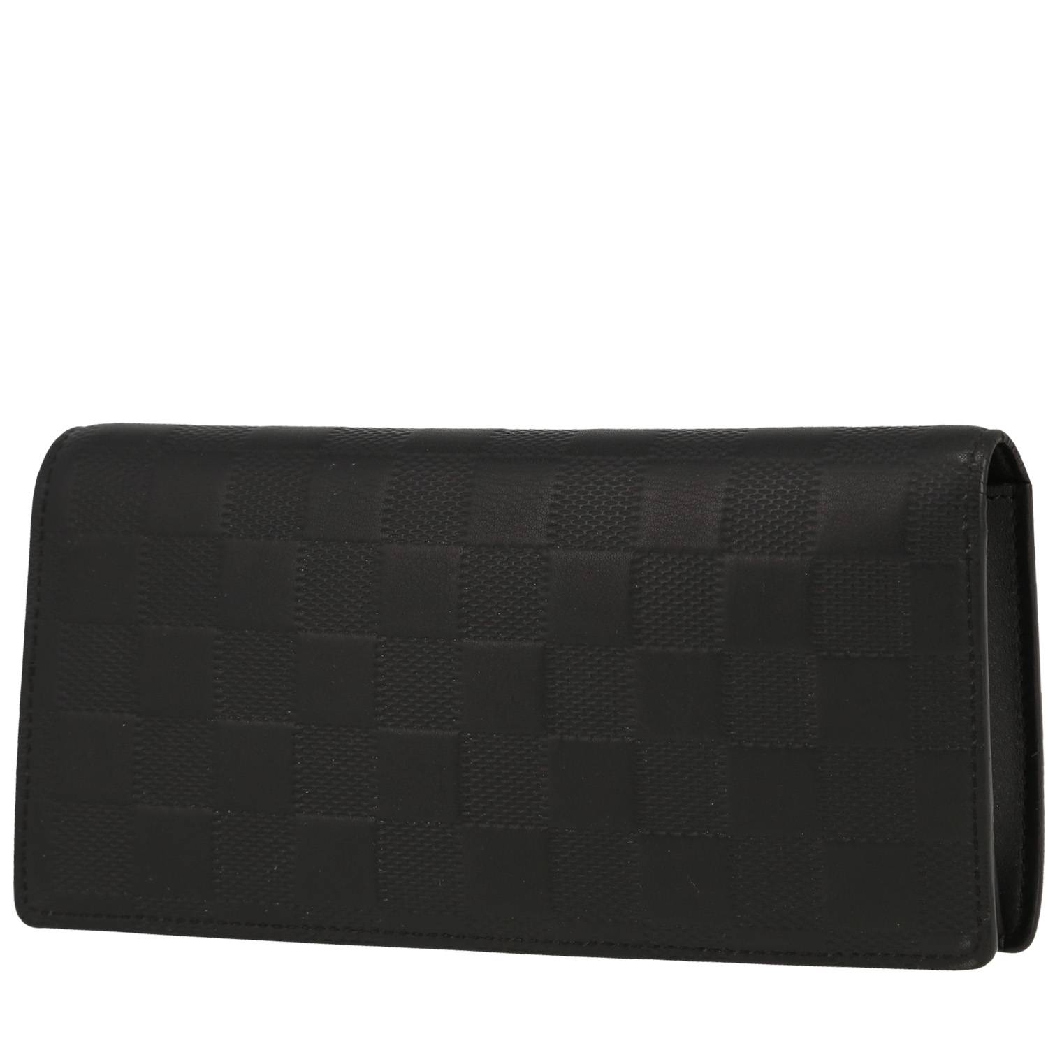 Práctica billetera Louis Vuitton de cuero negro a cuadros, adorno en metal plateado para llevar en la mano.