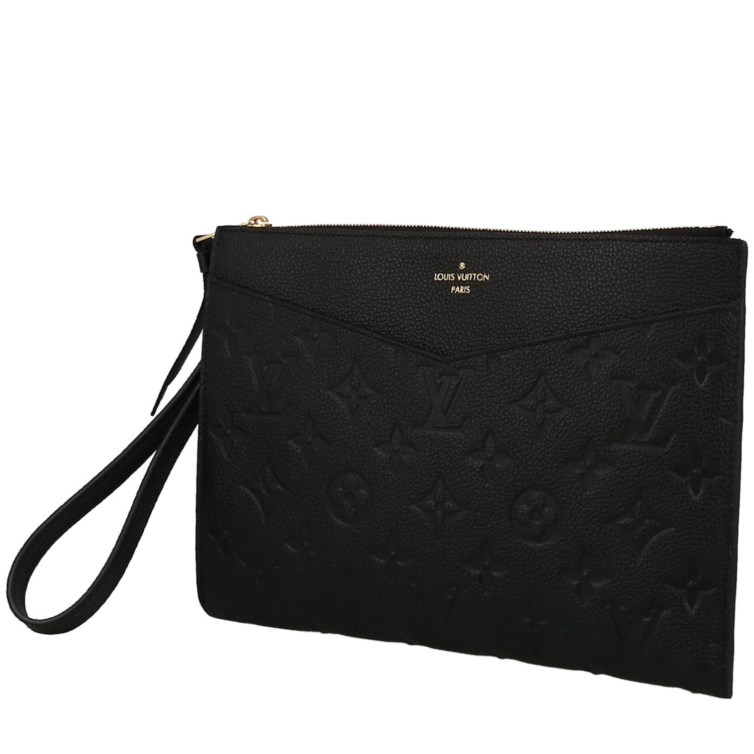 Bonito bolsito de mano Louis Vuitton de cuero monogram huella negro, adorno en metal dorado, asa sencilla de cuero negro para llevar en la mano.