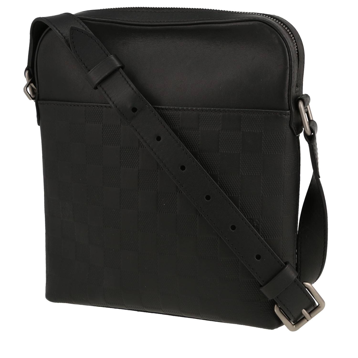 Práctico bolso bandolera Louis Vuitton de piel en damero grabada negro, adorno en metal plateado, bandolera ajustable de lona y cuero negra para llevar al hombro o cruzado.