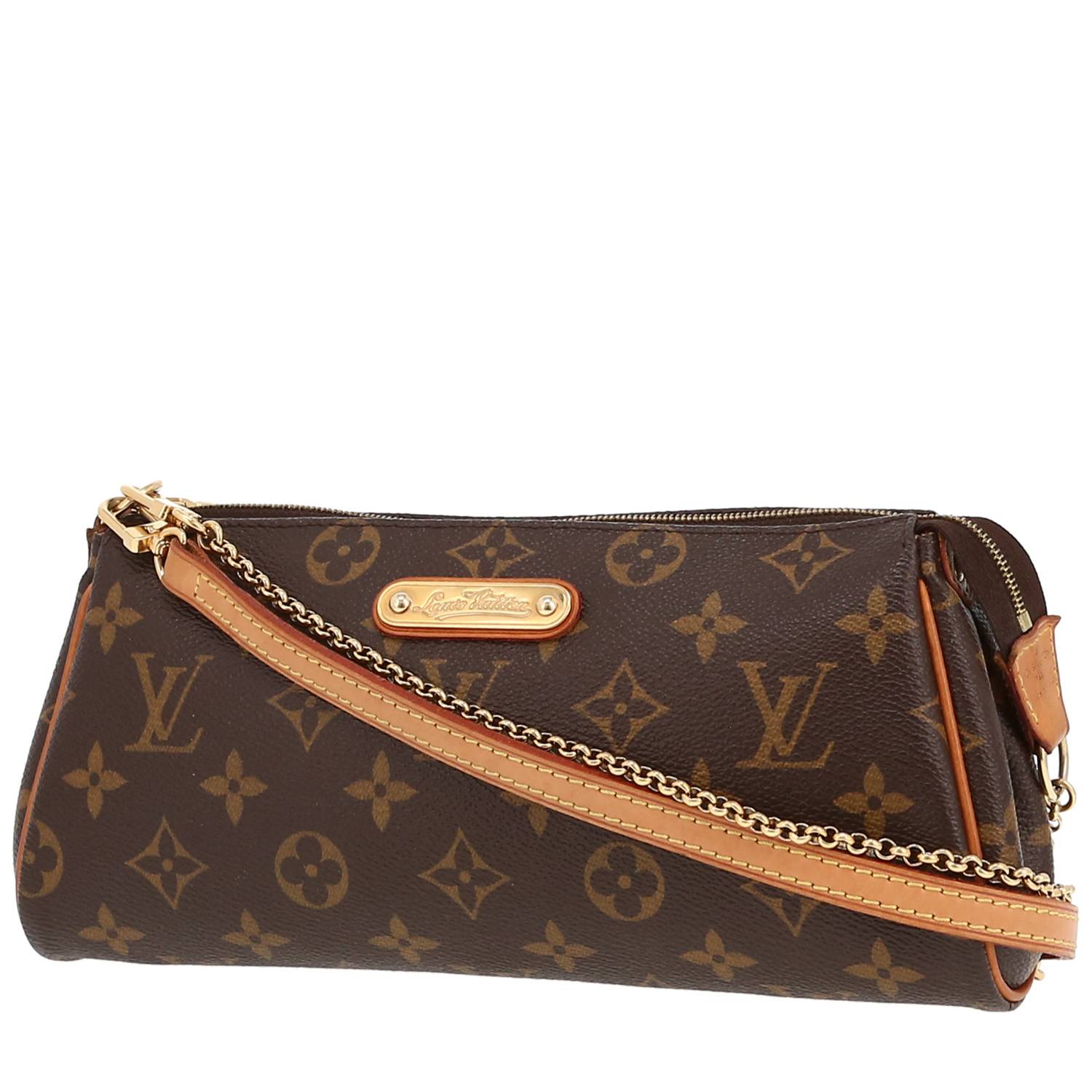 Clásico bolso/bolsito Louis Vuitton de lona Monogram y cuero natural, adorno en metal dorado, asa de cuero natural, una asa en cadena de metal dorado para llevar en la mano o al hombro.