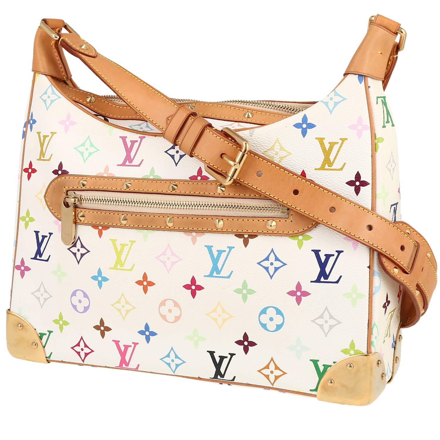 Inconfundible bolso bandolera Louis Vuitton Boulogne de lona Monogram blanco, adorno en metal dorado, asa ajustable de cuero natural para llevar en la mano o al hombro.