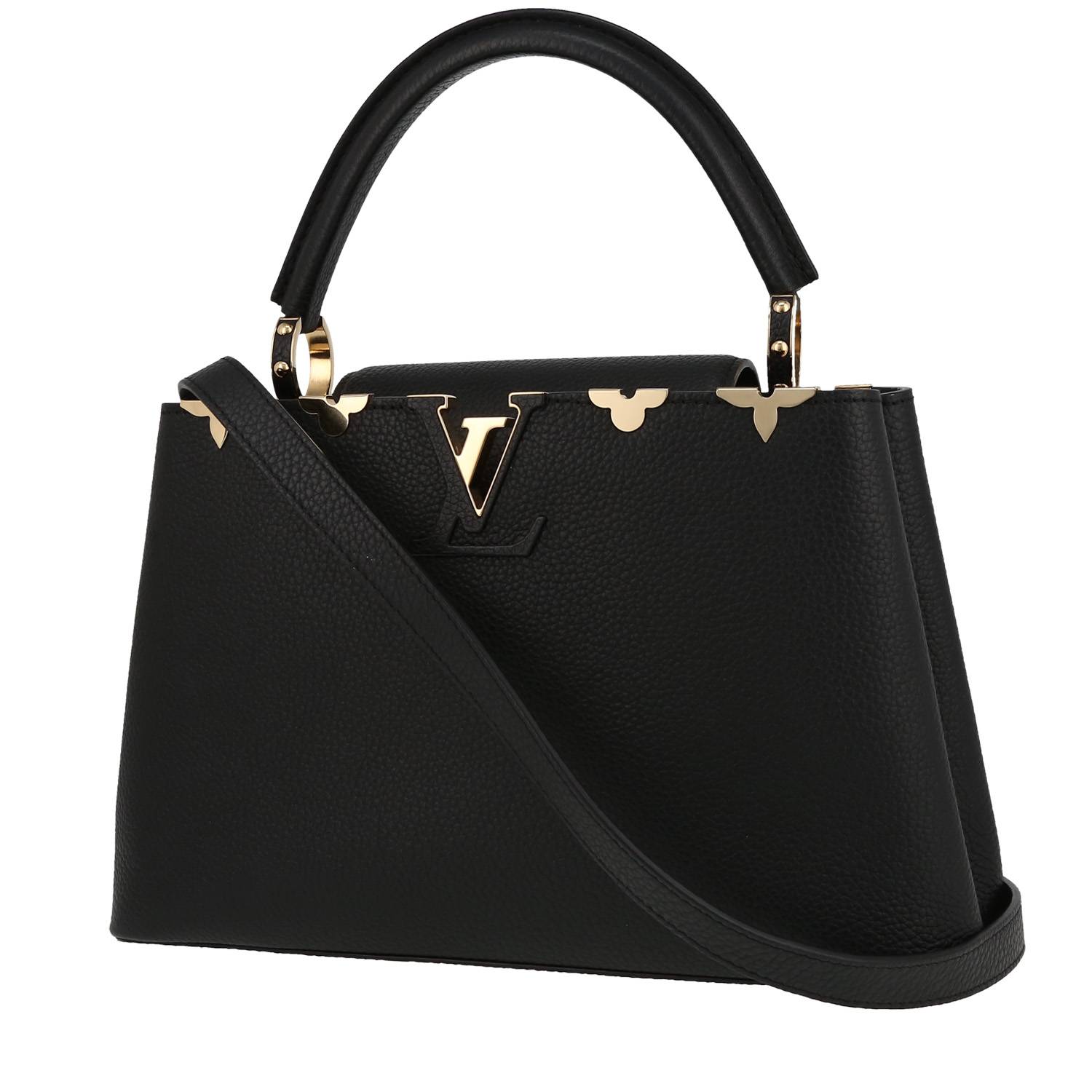 Inconfundible bolso de mano Louis Vuitton Capucines modelo mediano de cuero granulado negro, adorno en metal dorado, asa de cuero granulado negro, una bandolera extraíble de cuero granulado negro para llevar en la mano o colgado al hombro o cruzado.