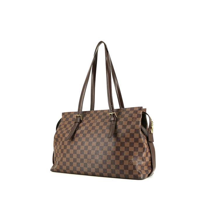 Intemporal bolso de mano Louis Vuitton Chelsea de lona a cuadros ébano y de cuero marrón, adorno en metal dorado, doble asa ajustable de cuero marrón para llevar en la mano o al hombro.