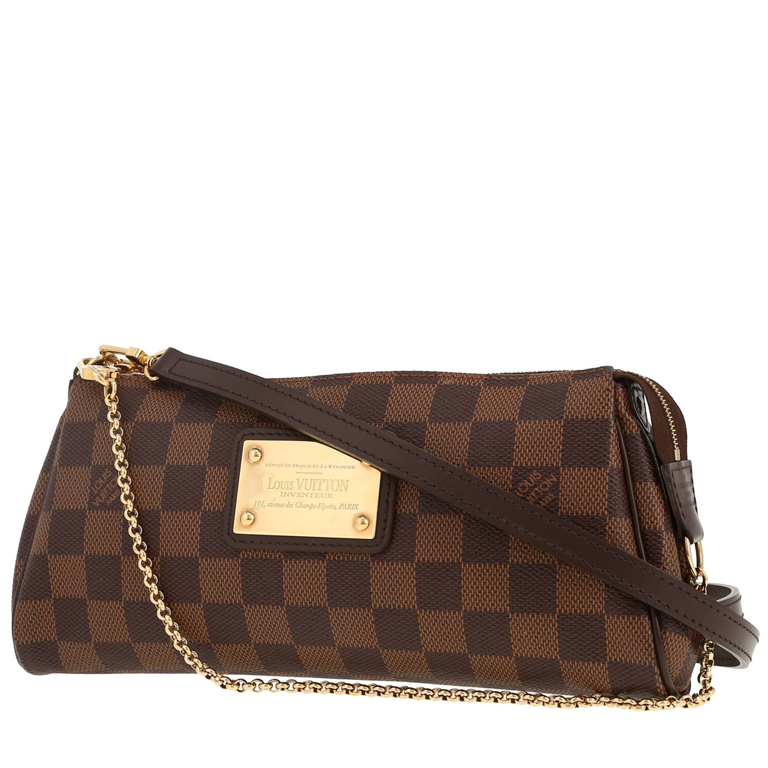 Magnífico bolso bandolera Louis Vuitton Eva de lona a cuadros ébano y cuero marrón, adorno en metal dorado, una asa en cadena de metal dorado, bandolera extraíble de cuero marrón para llevar en la mano o colgado al hombro o cruzado.