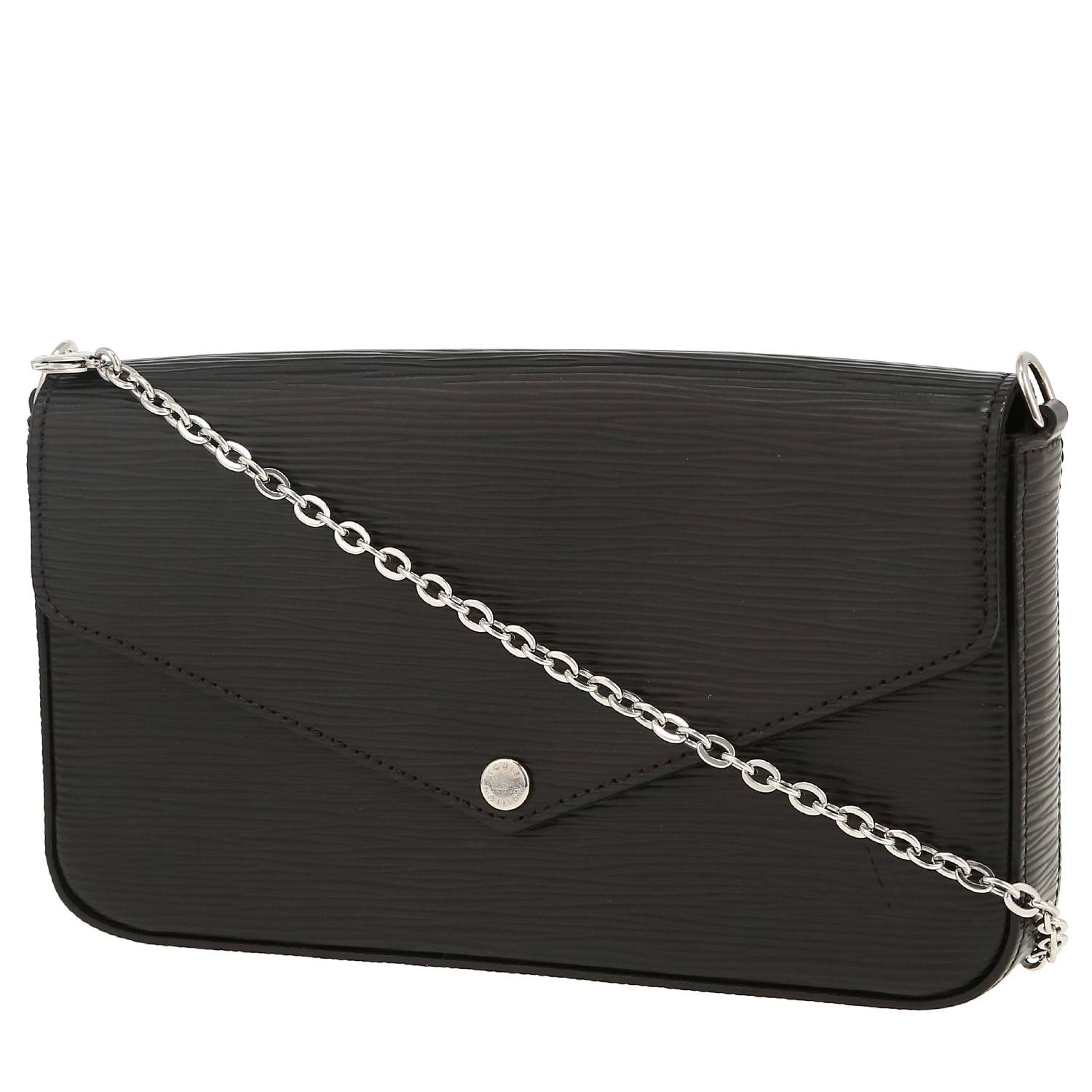 Excepcional bolso bandolera Louis Vuitton Félicie de cuero Epi negro, adorno en metal plateado, una asa en cadena extraíble de metal plateado para llevar en la mano o colgado al hombro o cruzado.