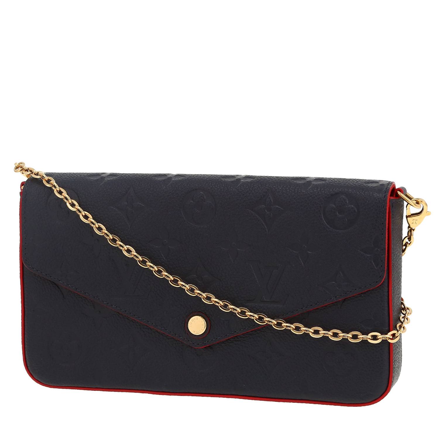 Inconfundible bolso bandolera Louis Vuitton Félicie de cuero monogram huella azul marino, adorno en metal dorado, una asa en cadena extraíble de metal dorado para llevar en la mano o colgado al hombro o cruzado.