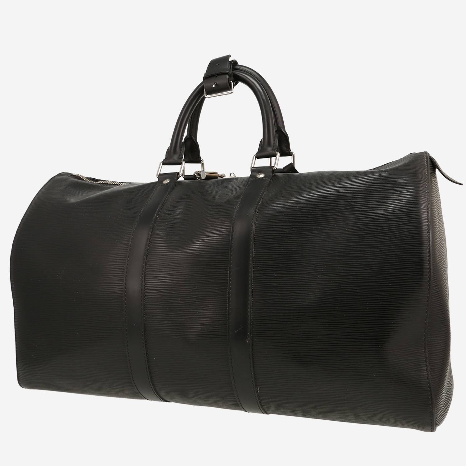 Encantadora bolsa de viaje Louis Vuitton Keepall 45 de cuero Epi negro, adorno en metal plateado, doble asa de cuero negro para llevar en la mano.