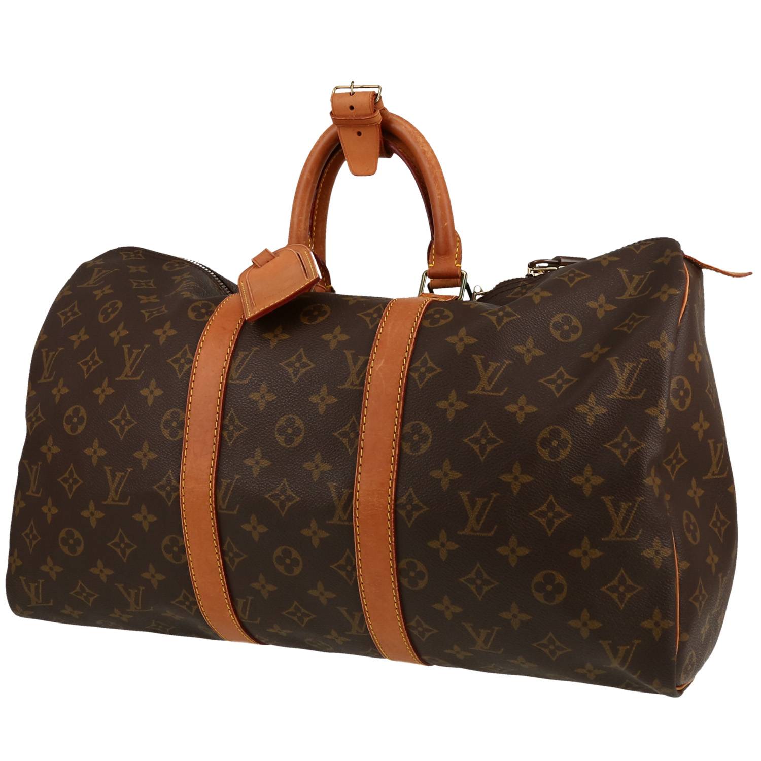 Inconfundible bolsa de viaje Louis Vuitton Keepall 45 de lona Monogram marrón y cuero natural, adorno en metal dorado, doble asa de cuero natural para llevar en la mano.