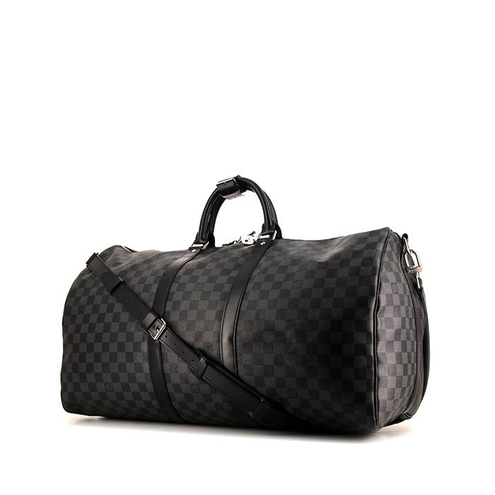 Inconfundible bolsa de viaje Louis Vuitton Keepall 55 cm de lona a cuadros revestida gris y de cuero negro, adorno en metal plateado, doble asa de cuero negro, bandolera extraíble y ajustable de cuero negro para llevar en la mano o colgado al hombro o cruzado.