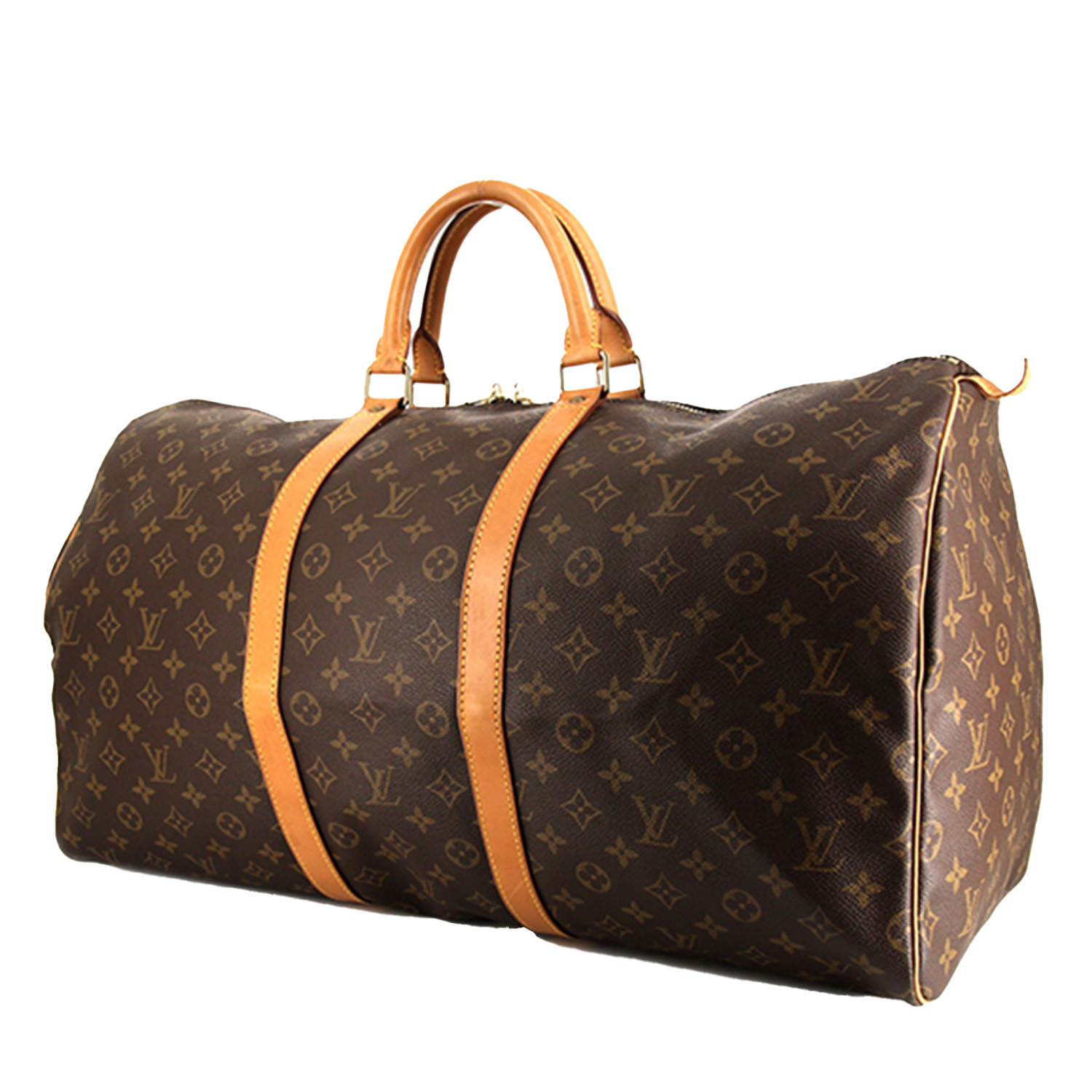 Elegante bolsa de viaje Louis Vuitton Keepall 55 cm de lona Monogram marrón y de cuero natural, adorno en metal dorado, doble asa de cuero natural para llevar en la mano.