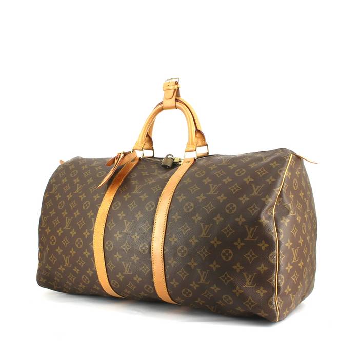 Bonita bolsa de viaje "Keepall 55 cm" de lona Monogram y de cuero natural, doble asa de cuero natural para llevar en la mano.