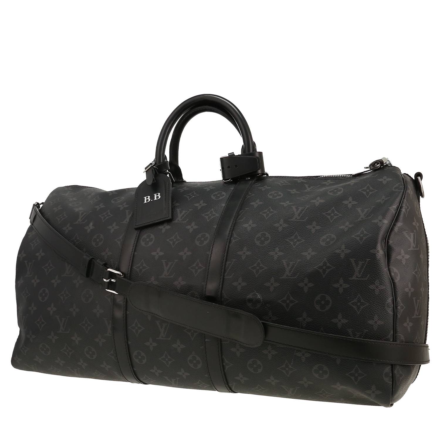 Inconfundible bolsa de viaje Louis Vuitton Keepall 55 de lona Monogram gris y negra y cuero negro, adorno en metal plateado, doble asa de cuero negro, una bandolera extraíble y ajustable de cuero negro para llevar en la mano o colgado al hombro o cruzado.