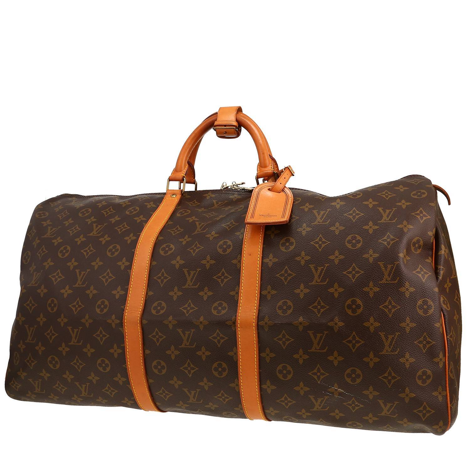 Intemporal bolsa de viaje Louis Vuitton Keepall 60 de lona Monogram marrón y cuero natural, adorno en metal dorado, doble asa de cuero natural para llevar en la mano.