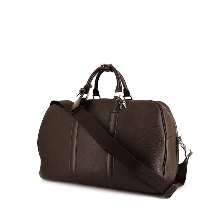 Elegante bolsa de viaje Louis Vuitton Kendall de cuero taiga marrón, adorno en metal plateado, doble asa de cuero marrón, asa extraíble y ajustable de lona marrón para llevar en la mano o colgado al hombro o cruzado.