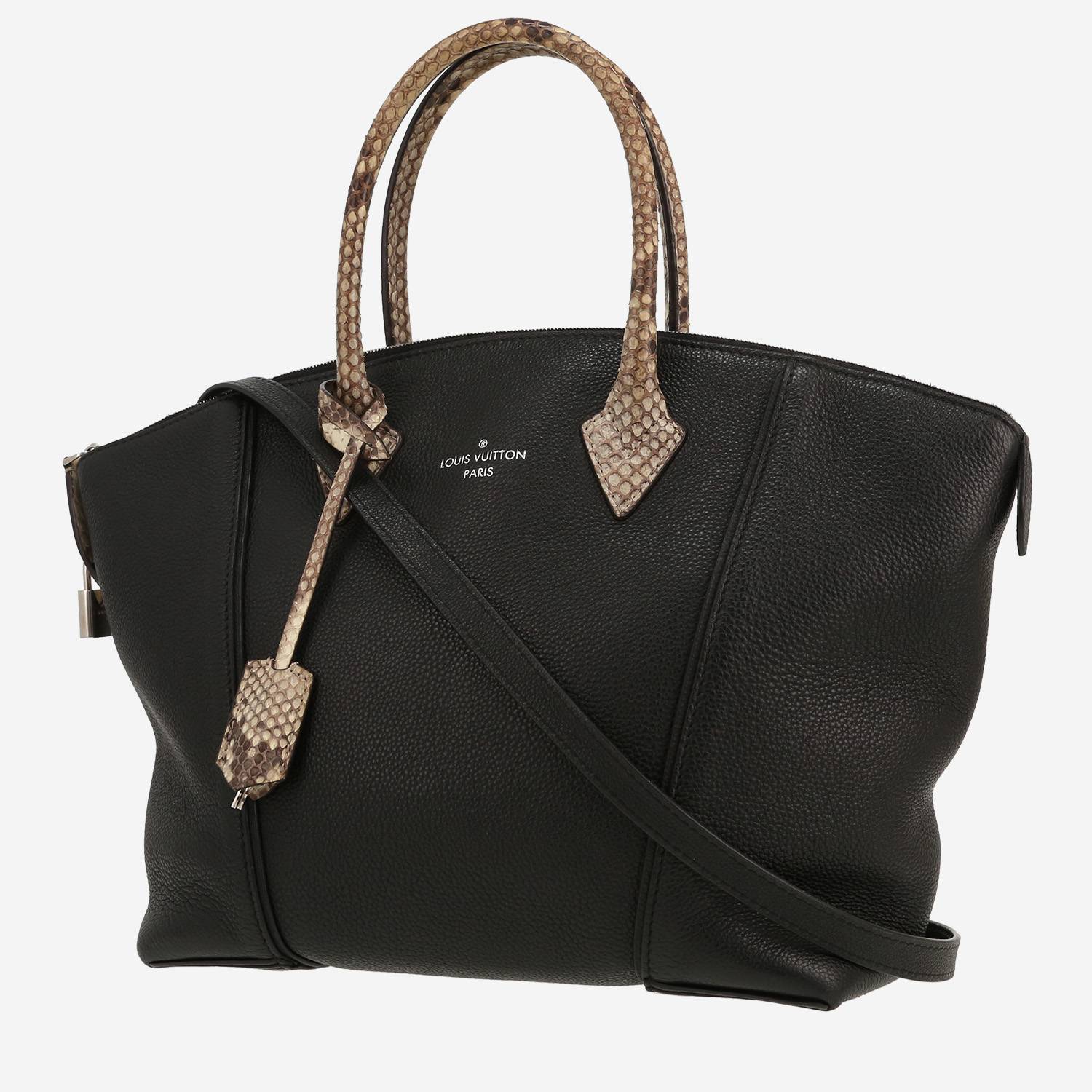 Encantador bolso de mano Louis Vuitton Lockit de cuero negro y piel de pitón, adorno en metal plateado, doble asa de piel de pitón, bandolera extraíble de cuero negro para llevar en la mano o colgado al hombro o cruzado.