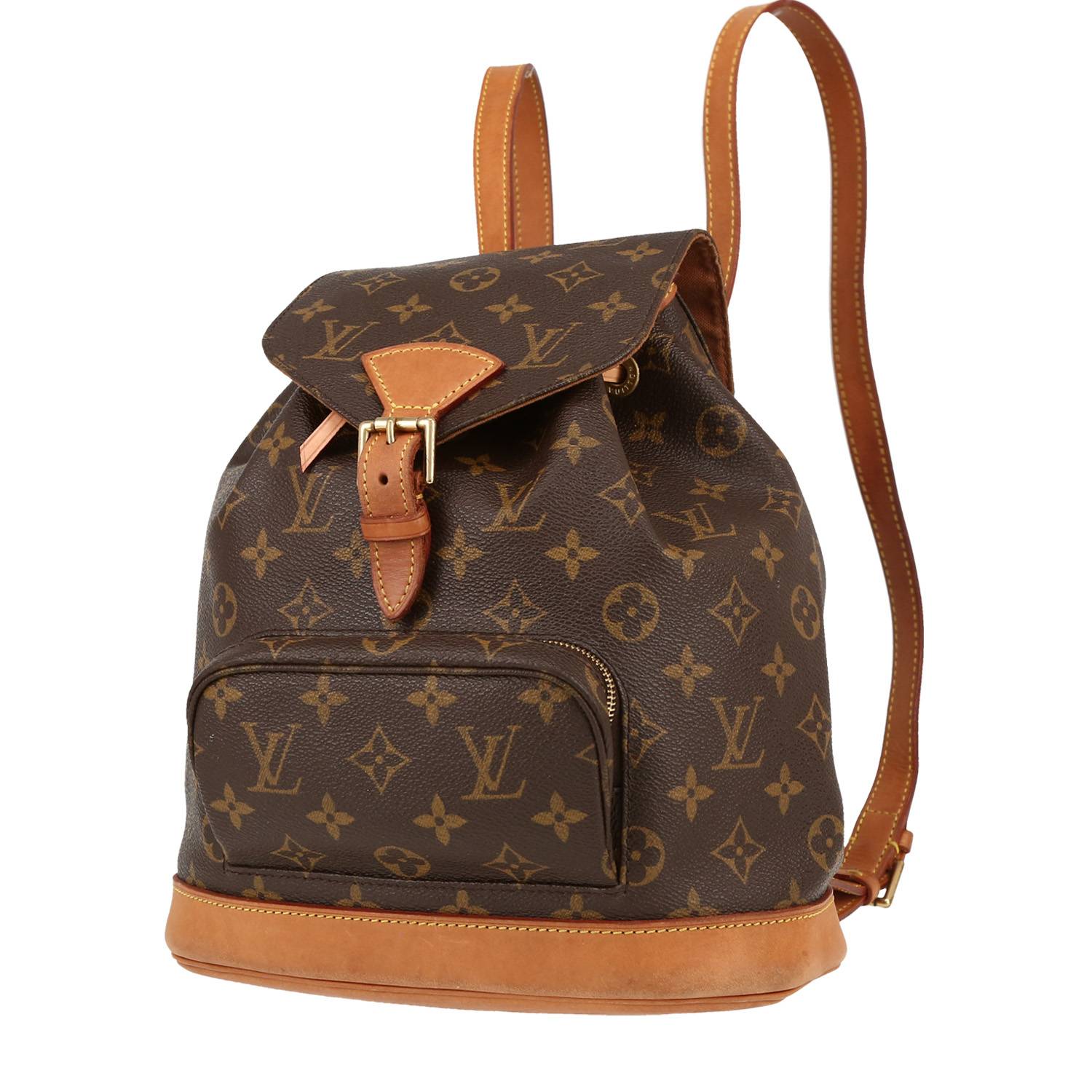 Práctica mochila Louis Vuitton Montsouris de lona Monogram marrón y cuero natural, adorno en metal dorado, doble asa ajustable de cuero natural para llevar en la espalda.
