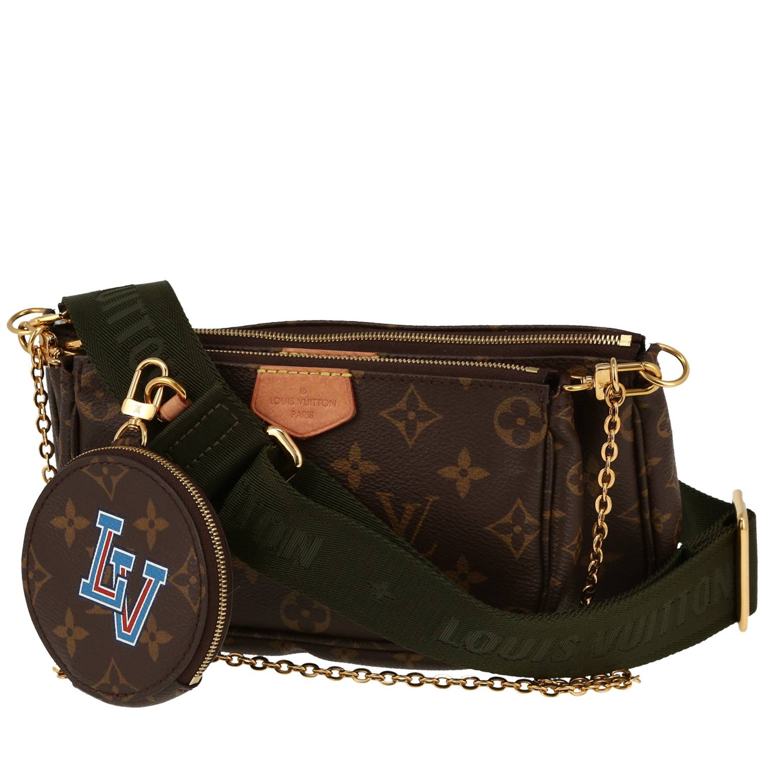 Práctico bolso bandolera Louis Vuitton Multi-Pochette de lona Monogram marrón y cuero natural, adorno en metal dorado, una asa en cadena de metal dorado, bandolera extraíble y ajustable de lona caqui para llevar al hombro o cruzado.
